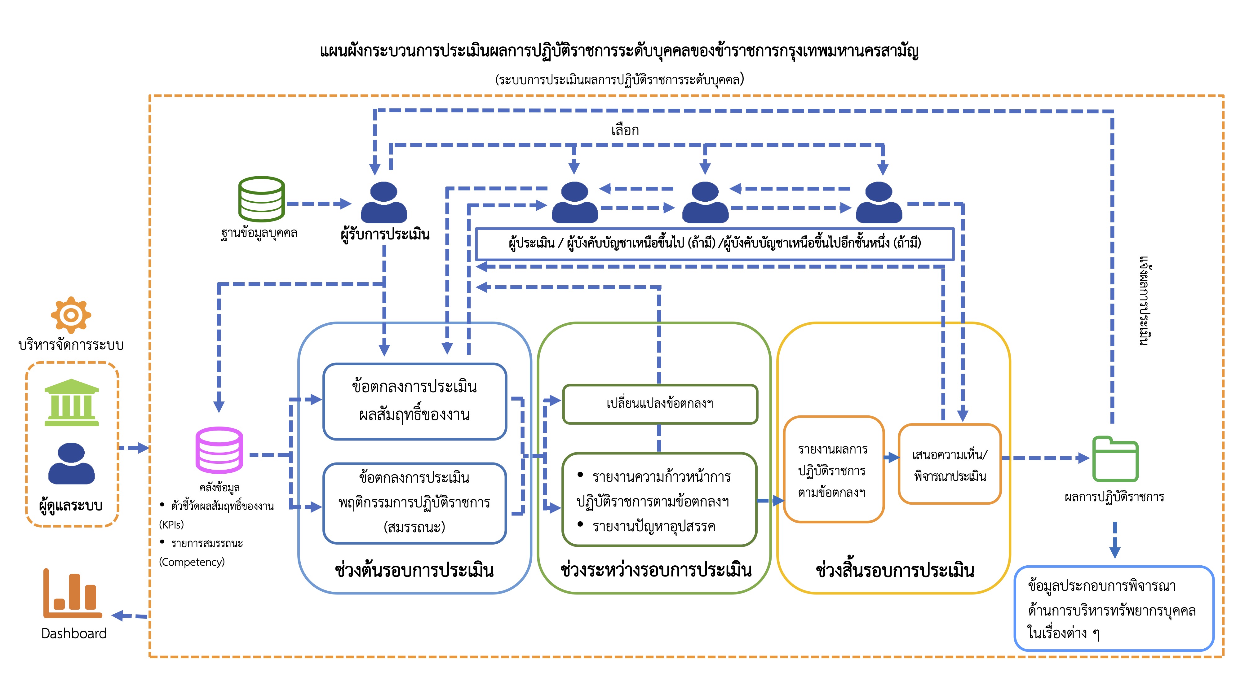 มีการบริหารจัดการข้อมูลผู้รับการประเมิน / ผู้บังคับบัญชาชั้นต้น / ผู้บังคับบัญชาเหนือขึ้นไป (ถ้ามี) / ผู้ประเมิน โดยข้อมูลจะมาจากระบบทะเบียนประวัติ และเชื่อมโยงข้อมูลกับการประเมินผู้ใต้บังคับบัญชาได้