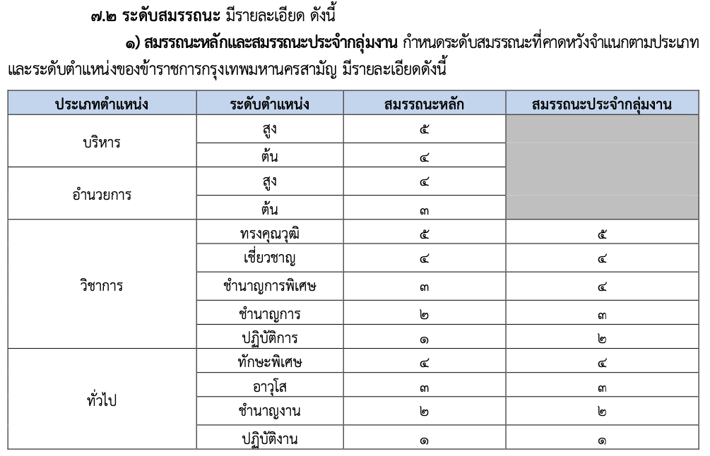 - กำหนดระดับสมรรถนะที่คาดหวังของข้าราชการกรุงเทพมหานครสามัญตามตำแหน่งประเภทและระดับตำแหน่ง แบ่งเป็น